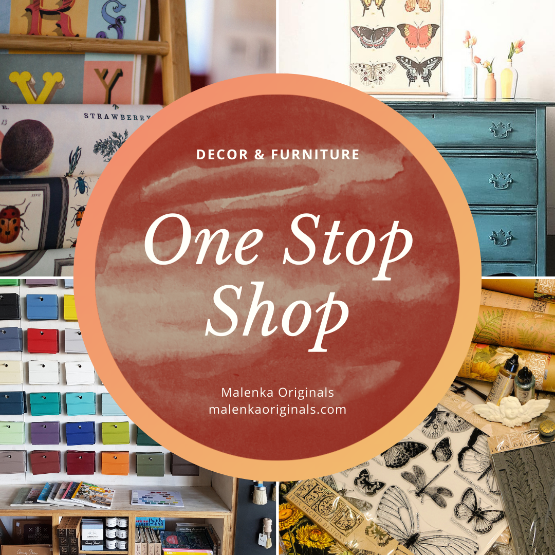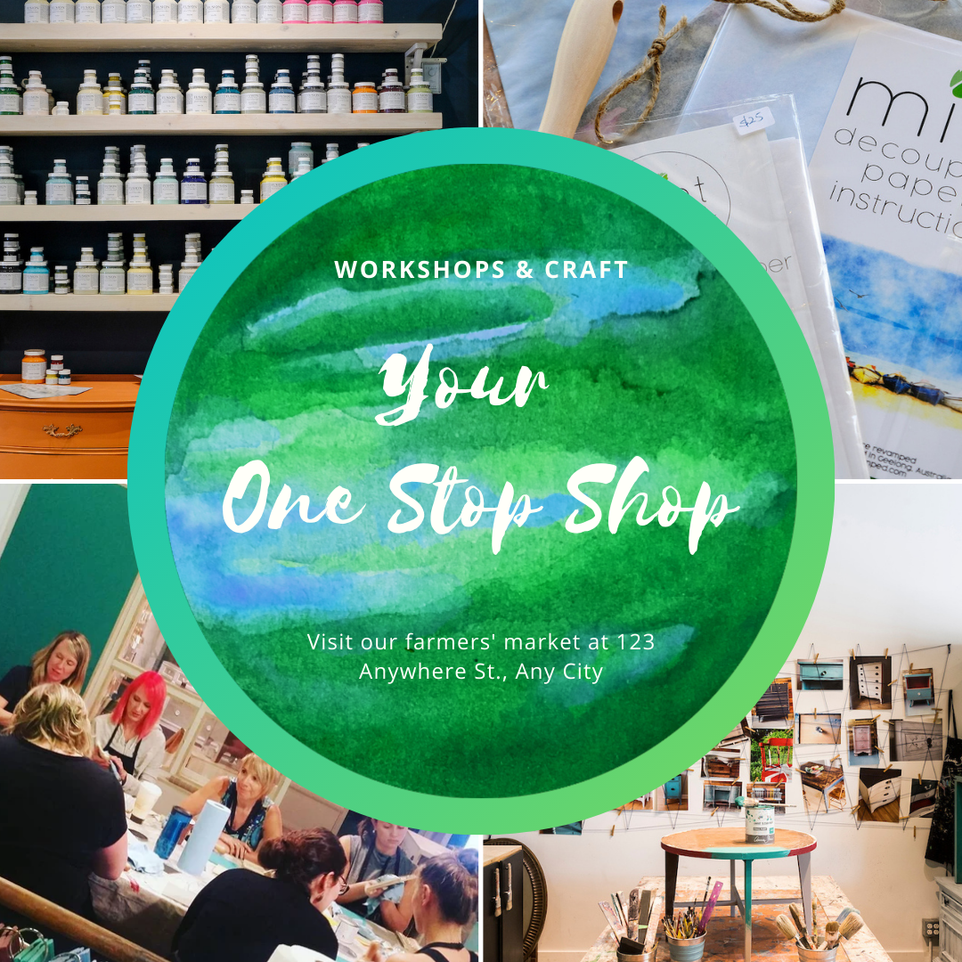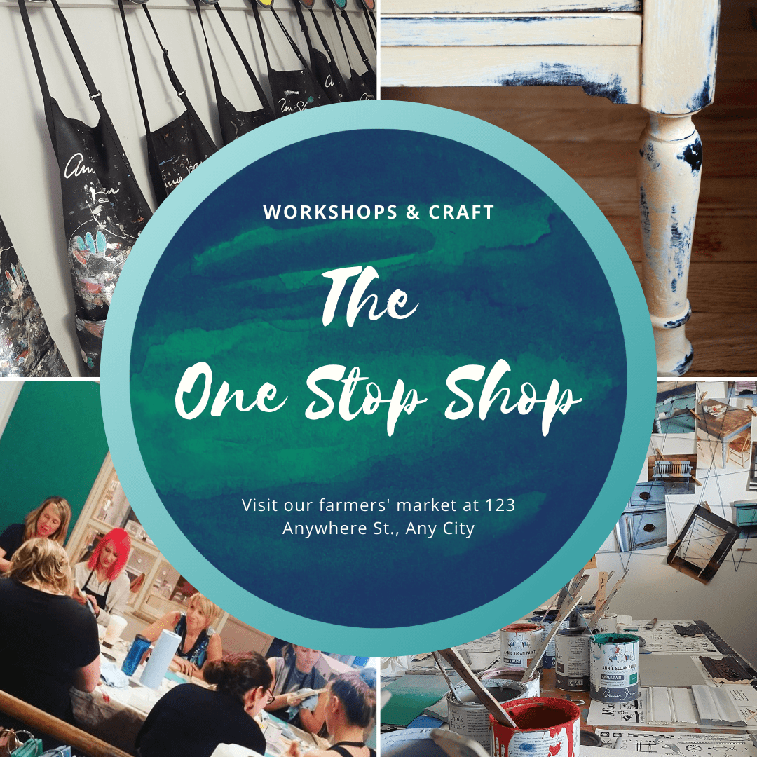 So I got to work creating some drafts as I was short on time, but during the opening meeting I described the layouts and composition. The layout for the Chalk Paint Ad would be featuring a painted furniture piece showing a before and after with basic text that expresses the idea of transformation. The layout for the One Stop Shop Ads would be a mosaic of images showing the three main varieties of products our client sold as well as some supporting central text.
